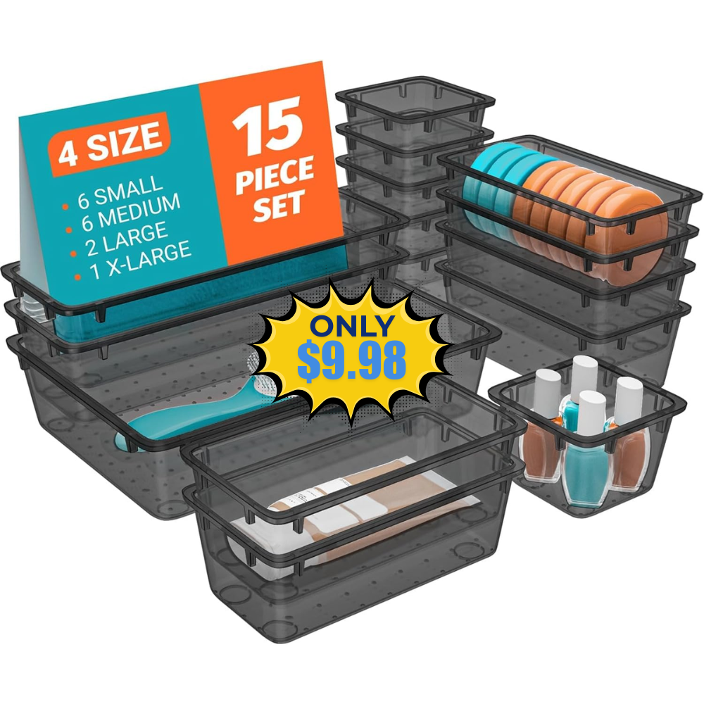 Save 29% off on this 15 PCS Clear Plastic Drawer Organizer Set without even using a coupon or promo code! This is awesome price for this product!