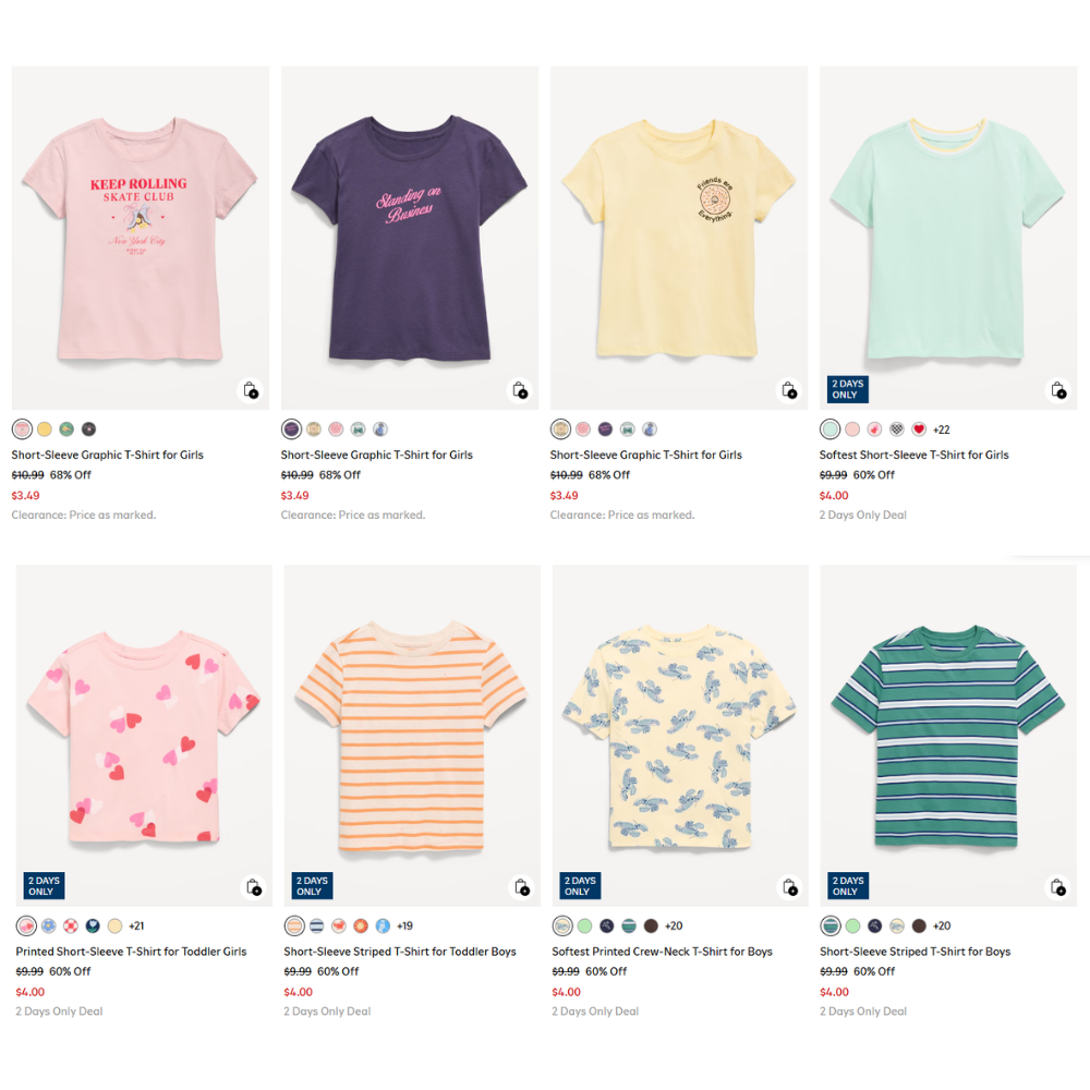 Old Navy is offering an amazing 2 Days Only Deal on tees. You can snag these tees for as low as $3.00, a significant savings from the regular price of $10.99. This deal is available at Old Navy without the need for a coupon or promo code, making it an even sweeter bargain. Head over to Old Navy to take advantage of this incredible sale and stock up on tees for the whole family.Grab this deal before it’s gone ?