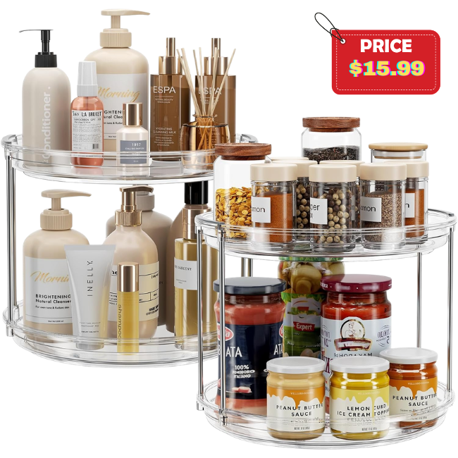 Save 35% off on this 2 Pack 2 Tier Lazy Susan Turntable Organizer without even using a coupon or promo code! This is awesome price for this product!Join our WhatsApp group, Telegram channel, and Facebook Group for kids’ deals, fashion deals, and other crazy deals.