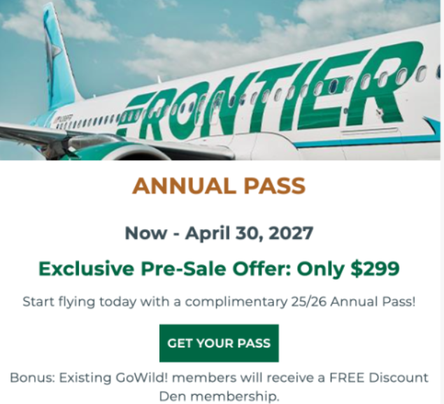 Limited Time Offer! Now through September 5, get the 2026–2027 GoWild! All-You-Can-Fly Annual Pass for just $299—50% off the regular price of $599!* That’s less than the average cost of a single domestic ticket on other U.S. airlines.**Even better? You can start flying immediately—no need to wait for the official travel period in May 2026. That means up to 8 extra months of unlimited travel with Frontier!