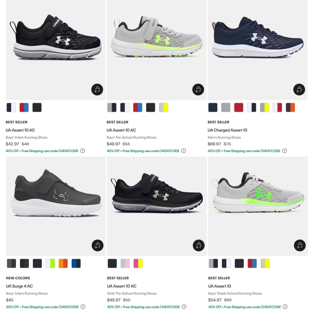 CHEATCODE & EXTRA10Copy to ClipboardJump over to Under Armour where you can snag amazing savings on this Assert 10 Running Shoes On Sale from $23.20 (regularly $48)! Use promo code CHEATCODE & EXTRA10 to get this amazing discount.Join our WhatsApp group, Telegram channel, and Facebook Group for kids’ deals, fashion deals, and other crazy deals.