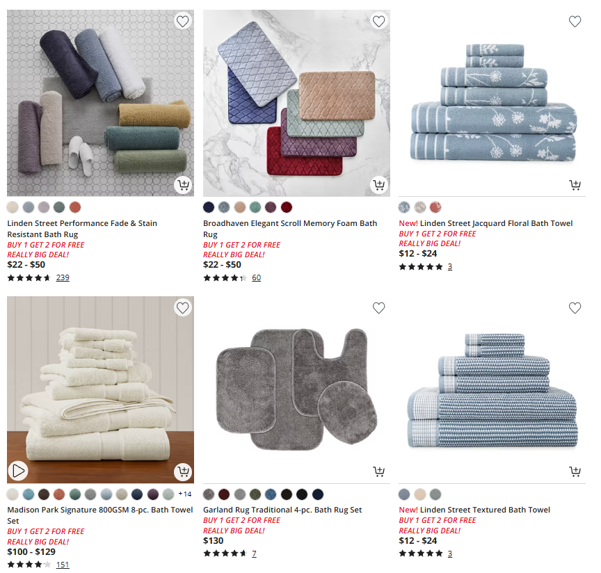 Jump over to JCPenney where you can snag amazing savings on this Buy 1, Get 2 Free Towels & Bath Rugs. You can save more even without using a coupon or promo code!