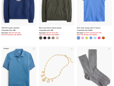 Share January 6, 2026JCrew Factory Sale: Up to 89% Off Men’s & Women’s Apparel and AccessoriesAccessoriesClothingJ.Crew Factory 0