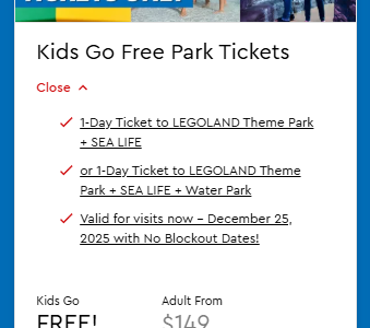 Share September 22, 2025Kids Go Free Park Tickets LEGOLAND California Deal: Save at LEGOLANDExpired DealsFreebiesLEGOLAND 0