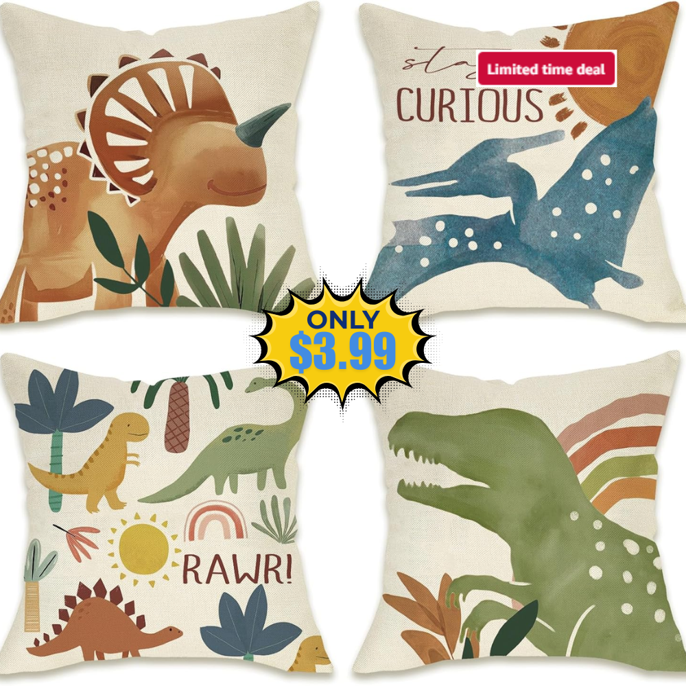 Get ready to decorate your home with a set of 4 Dinosaur Throw Pillow Covers. This set is now available at an awesome price with a 50% discount. You can save 50% off the original price without using any coupon or promo code, which is a fantastic deal. Shop now and take advantage of this incredible offer to give your home a unique touch with these dinosaur-themed pillow covers.Grab this deal before it’s gone ?