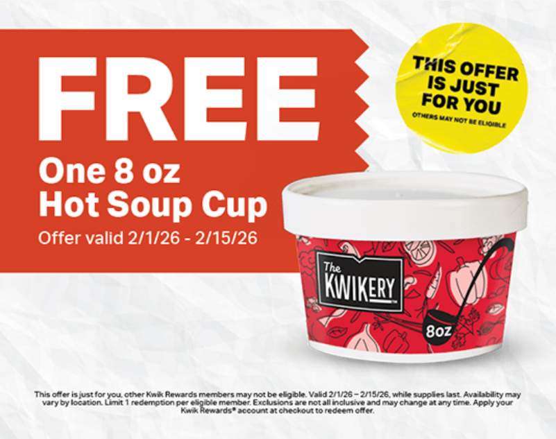 Warm Up with a FREE Cup of Soup at Kwik Trip! ? Beat the February chill with a little comfort on the house! Right now, eligible Kwik Rewards members can snag a free 8oz soup cup. To see if the deal is waiting for you, just log in to the Kwik Rewards app and add the offer to your account. Stop by before February 15th to grab your favorite flavor—whether it’s Chicken Noodle or that legendary Beer Cheese!