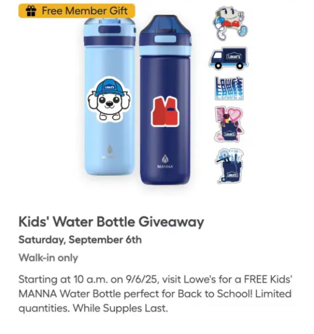 Get ready for back to school! On September 6, 2025, starting at 10 a.m., visit Lowe’s to pick up a FREE Kids’ MANNA Water Bottle. Just walk in, show your rewards account QR code, and claim your free gift while supplies last!