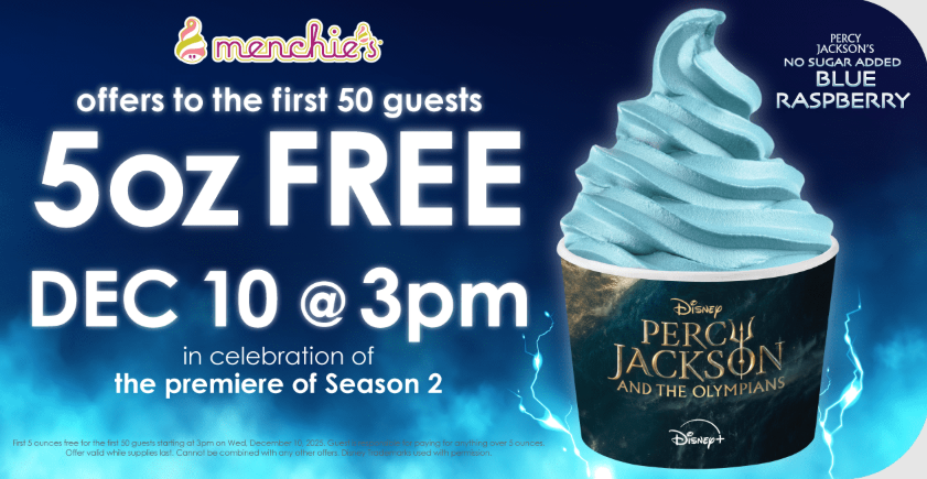 FREE Frozen Yogurt Alert! Menchie's Giveaway on December 10th! Be one of the first 50 guests at Menchie's on December 10th at 3 PM and receive a FREE 5 oz Frozen Yogurt! Arrive on time—this freebie is only for the first 50!