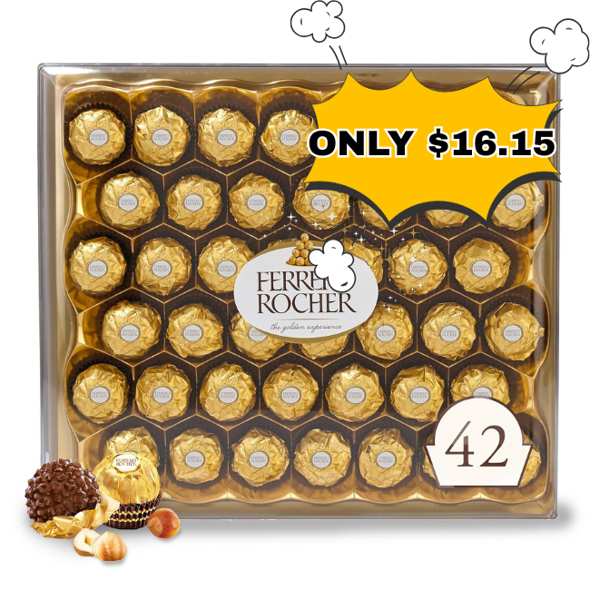 Save on Ferrero Rocher, 42 Count, Premium Milk Chocolate Hazelnut without even using a coupon or promo code! This is awesome price for this product!Join our WhatsApp group, Telegram channel, and Facebook Group for kids’ deals, fashion deals, and other crazy deals.