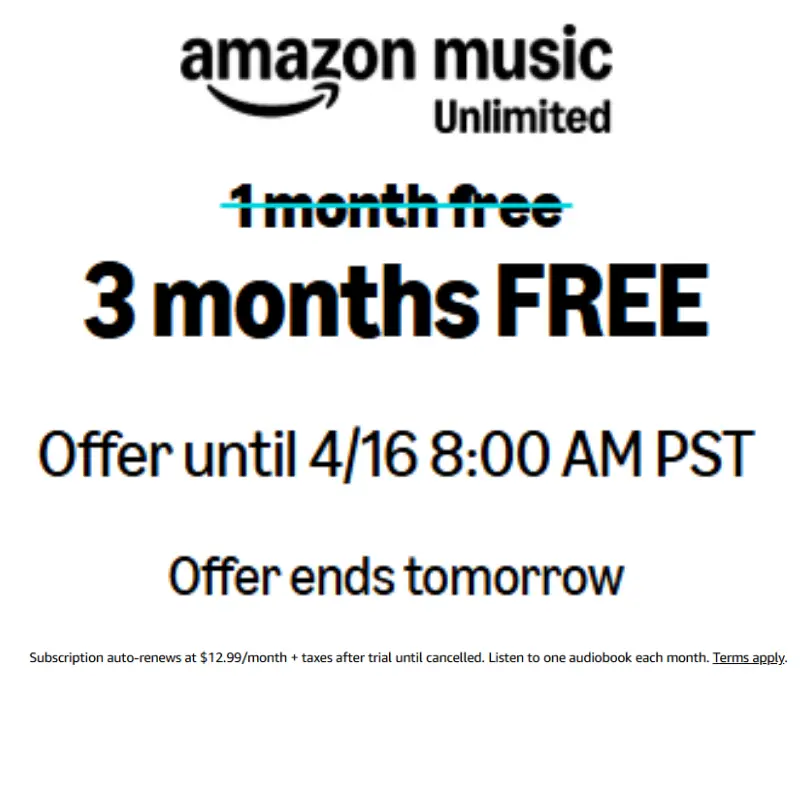 This is the final call for the Amazon Music 3 Months Free promo. The offer ends tomorrow (Thursday) at 11am EST. After that, it will revert to a 30-day free trial. This has been a strong performer, so we recommend pushing hard to capture final volume. Current Offer (through 11am EST tomorrow): 3 months of Amazon Music free, plus 1 free Audible audiobook per month during the trial. After 11am EST: reverts to a 30-day free trial.