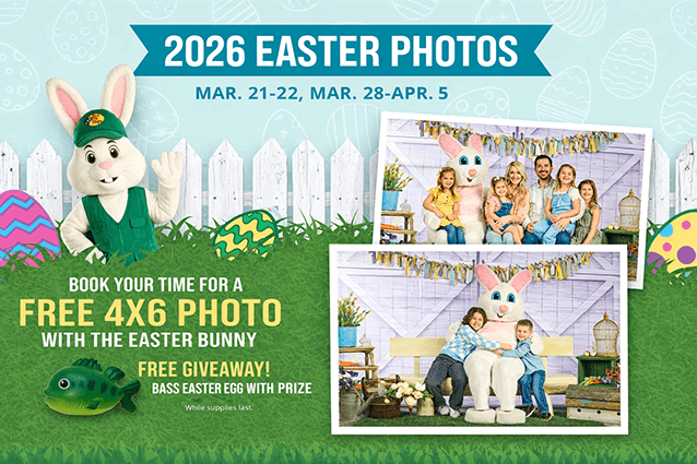 Celebrate Easter at Bass Pro Shops and Cabela’s with a FREE photo session with the Easter Bunny. The event runs on multiple weekends in March and April, with reservations opening on March 15 for the first weekend. Guests can book their visit up to 7 days ahead of time. While you’re there, kids can also receive a special Bass Easter egg filled with a surprise prize, available while supplies last. Check out the Easter photo schedule to plan your visit.