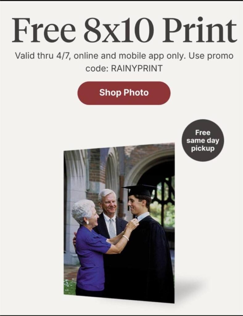 RAINYPRINTCopy to ClipboardJump over to Walgreens where you can snag amazing savings on this FREE 8×10 Photo Print! That’s an amazing savings by using a promo code RAINYPRINT!