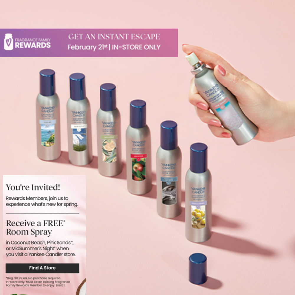 Yankee Candle is offering a FREE Room Spray to existing Fragrance Family Rewards members on February 21. The freebie is available in-store only, and members can choose from Coconut Beach, Pink Sands, or Midsummer’s Night. No purchase is required to receive this freebie. This is a great opportunity for customers to get a premium fragrance at no cost. Simply stop by a participating Yankee Candle location on February 21 to get your free room spray.