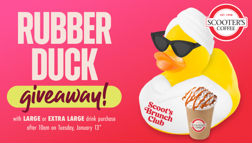 On January 13, customers can receive a FREE Scooter’s Coffee Duck when they purchase any beverage. These branded ducks are a popular giveaway and are typically available while supplies last.