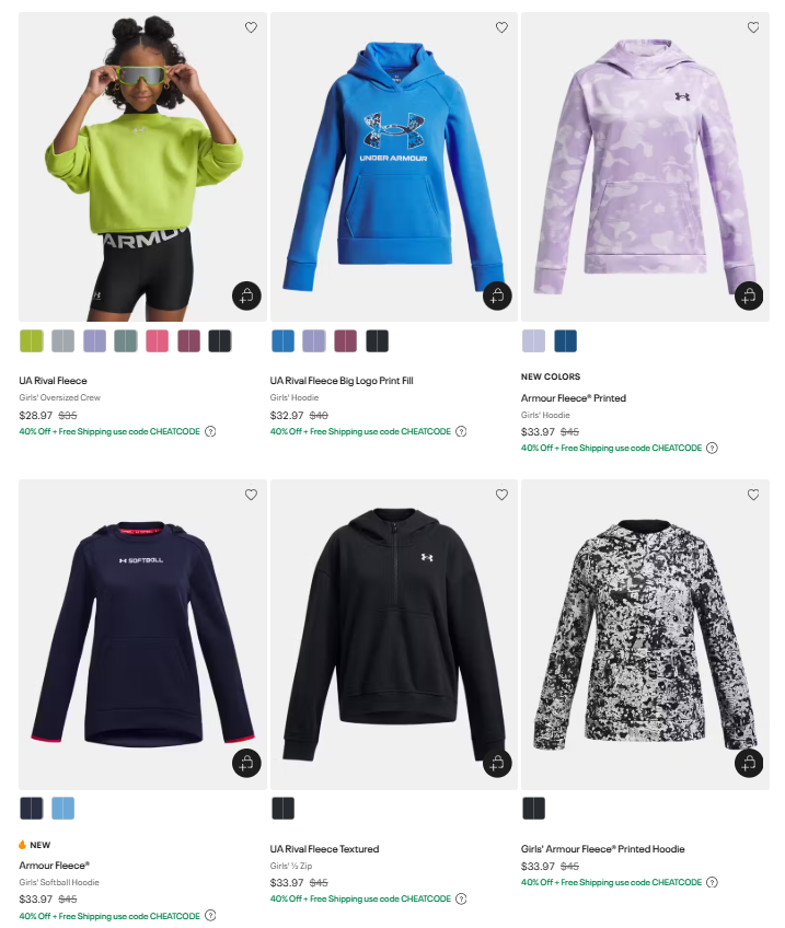 CHEATCODECopy to ClipboardJump over to Under Armour where you can snag amazing savings on this Hoodies On Sale from $14.77 (regularly $35)! Use promo code CHEATCODE to get this amazing discount.Join our WhatsApp group, Telegram channel, and Facebook Group for kids’ deals, fashion deals, and other crazy deals.