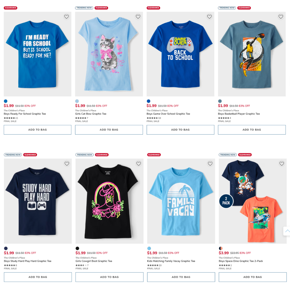 Jump over to The Children’s Place where you can snag amazing savings on this Kids Clearance Graphic Tees & T-Shirts from $1.99. You can save more even without using a coupon or promo code!