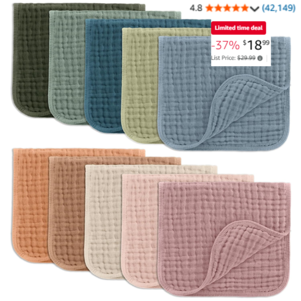 Save 37% instantly on Muslin Burp Cloths 20″ x 10″, Pack of 10—no coupon or promo code required! This limited-time offer won’t last long.