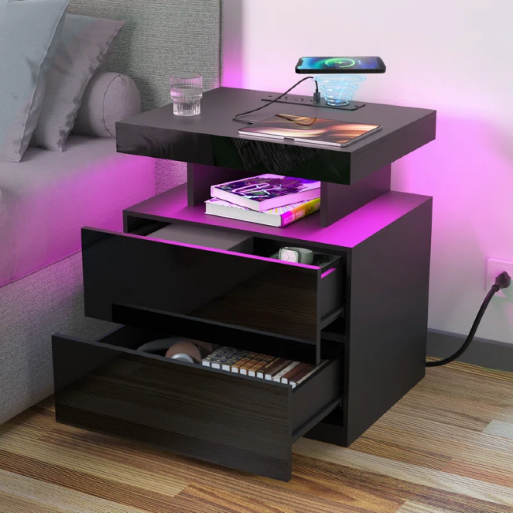 Nightstand with Wireless Charging Station, LED Light and 2 Drawers under $110