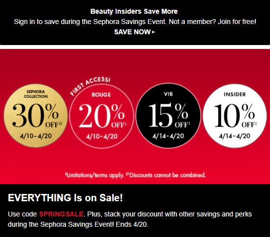 SPRINGSALECopy to ClipboardJump over to Sephora where you can snag amazing savings on this Savings Event: 30% Off Sephora Collection + 10% Off Everything Else! Use promo code SPRINGSALE to get this amazing discount.